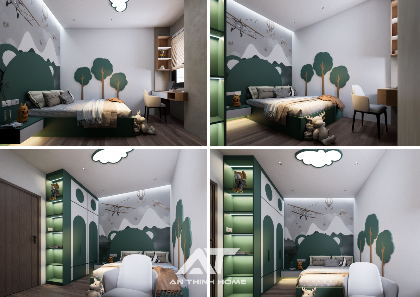 Màu sắc: Tone xanh lá chủ đạo giúp kích thích thị giác và sự sáng tạo của trẻ. Hệ tủ quần áo được cách điệu với các ô kệ trang trí, giúp bé hình thành thói quen ngăn nắp từ nhỏ.