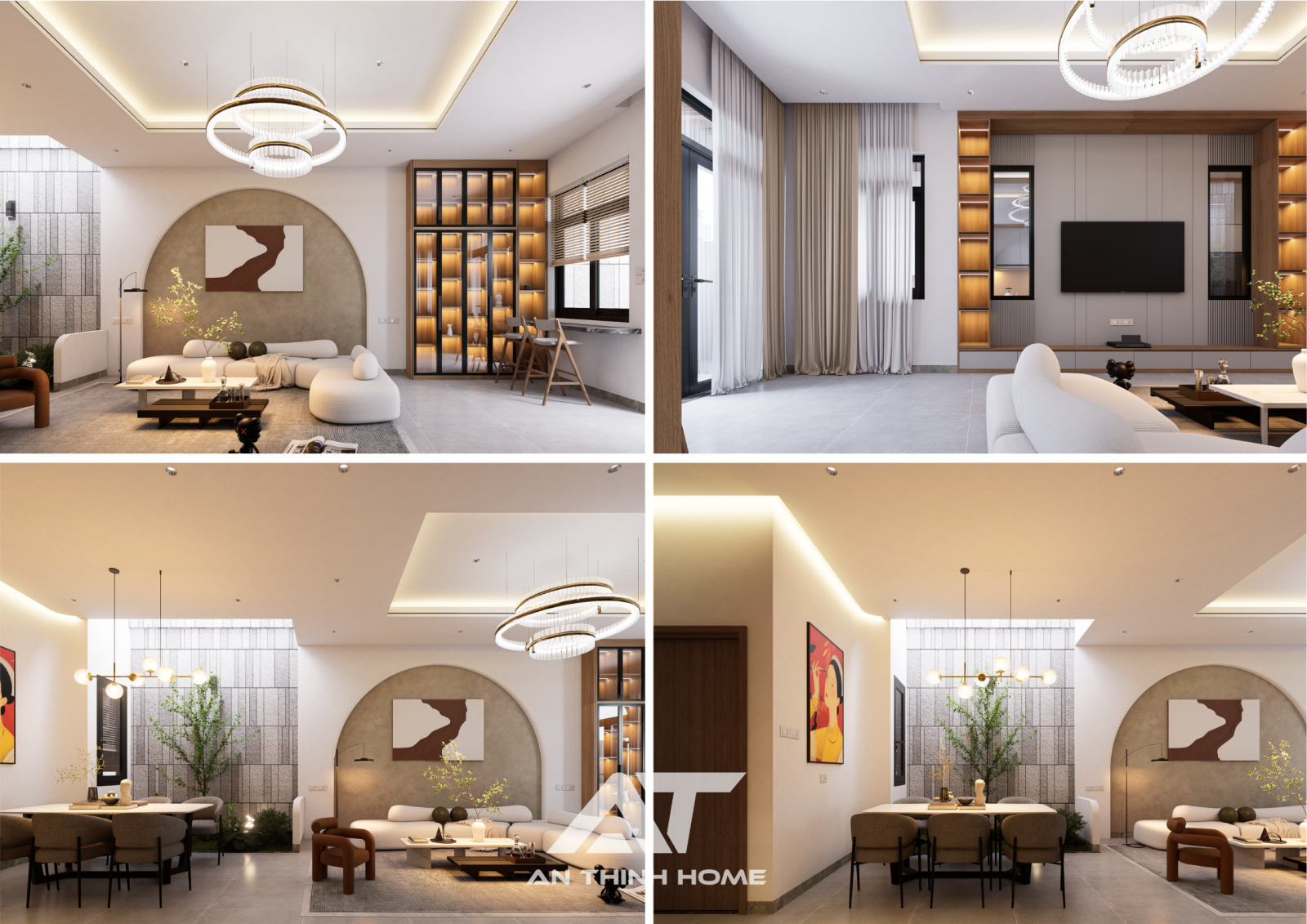 Phòng khách: Sử dụng tone màu trung tính (trắng - xám - gỗ). Mảng tường phía sau sofa được thiết kế vòm cong nghệ thuật, kết hợp đèn thả trần hiện đại tạo nên điểm nhấn đẳng cấp.