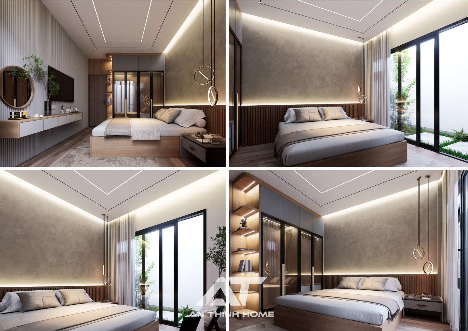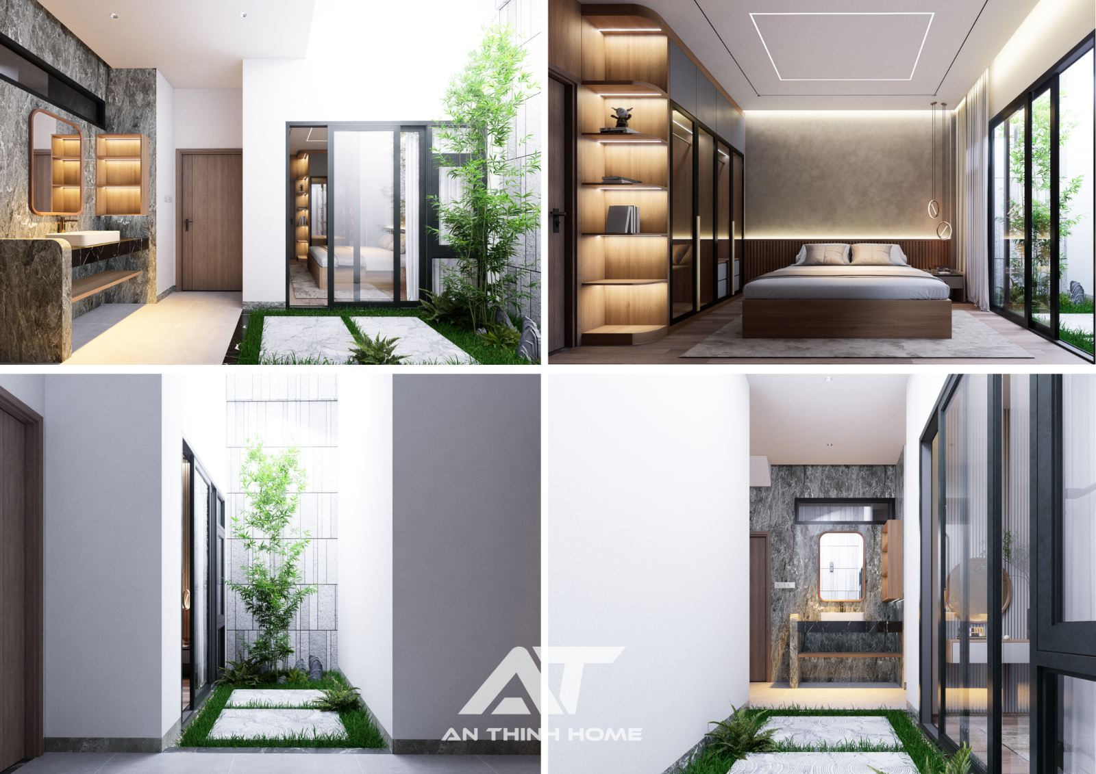 Kết nối thiên nhiên: Cửa kính lớn mở rộng tầm nhìn ra khu vực tiểu cảnh xanh mát, giúp chủ nhân tái tạo năng lượng sau một ngày làm việc dài. Hệ tủ quần áo cánh kính hiện đại vừa là nơi lưu trữ, vừa là món đồ trang trí tinh tế.